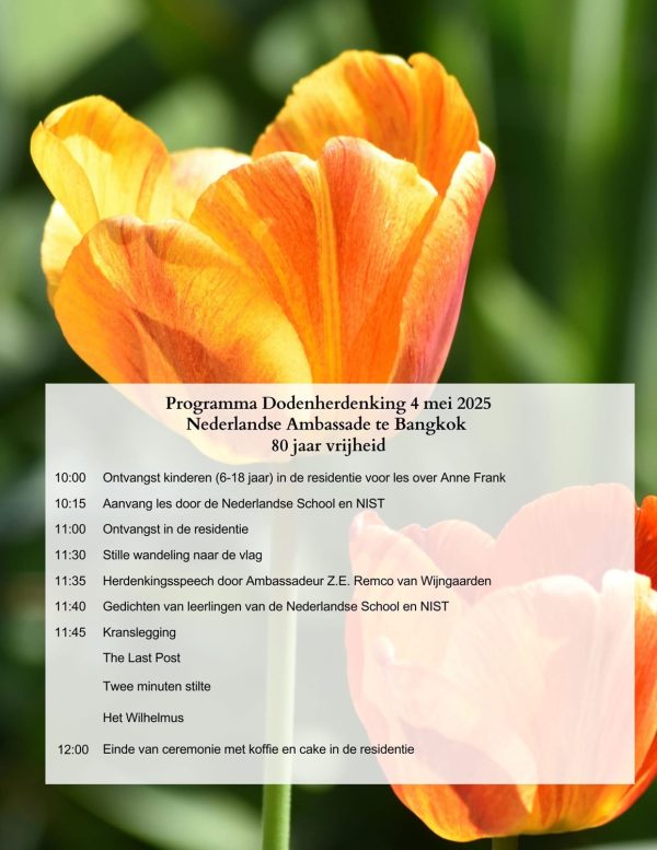 Op zondag 4 mei zal er in de tuin van de Nederlandse residentie te Bangkok een ceremonie in het kader van de Nationale Dodenherdenking worden gehouden. We nodigen hierbij allen uit om samen te komen om de slachtoffers van de Tweede Wereldoorlog, de koloniale oorlog in Indonesiรซ en van oorlogssituaties en vredesmissies nadien te herdenken.